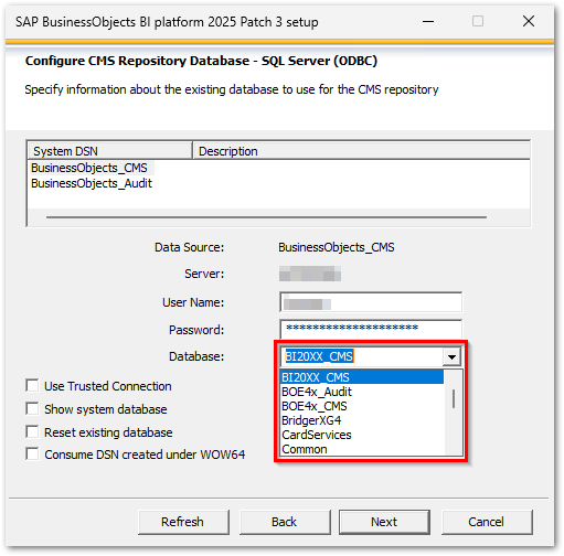 I am attempting to install BI 2025 Patch 3 on a new Window Server 2025 Standard server. I had one of my DBAs create blank CMS and Audit databases on a SQL Server 2019 server. My 64-bit ODBC connections (CMS and Audit) using the Microsoft ODBC Driver 18 for SQL Server test out just fine.