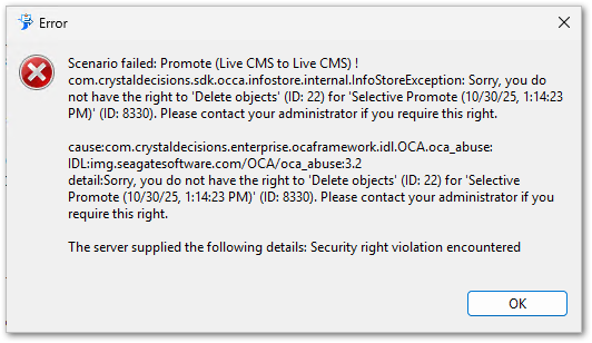 We are attempting to promote all objects from a BI Platform 4.3 Support Pack 4 Patch 7 system to a BI 2025 Patch 4 system with the Promotion Management Wizard (PMW). I am designating my destination system as the Central CMS.